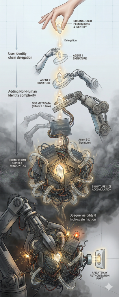 Standards groups are rushing to fill this void. The IETF has seen a surge in interest regarding OAuth 2.0 On-Behalf-Of (OBO) flows specifically tailored for AI. The goal is to move beyond static service accounts and toward a system where an agent carries a cryptographically bound delegation from the user that can be used to track or authorize access downstream. This ensures that every action the agent takes is traceable back to the original user's permissions. As we look at agentic architectures with chains of AI agents, this provides traceable trust. However, much like a chain of signed certificates for websites, each agent will need to add its own digital signature, leading to problems (such as signature size) down the line.